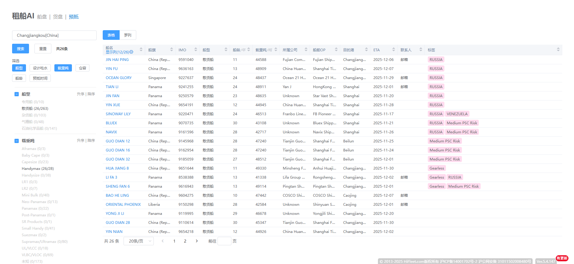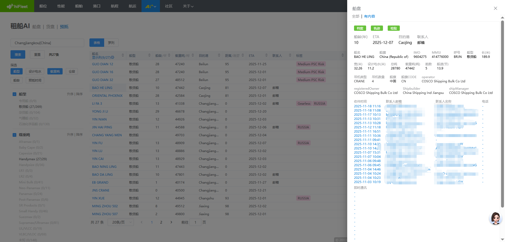 - 标签化关键字段:设备与吊机能力、舱口与甲板强度、燃料与环保、冷藏能力、危险品与消防、PSC和制裁风险等,一目了然!