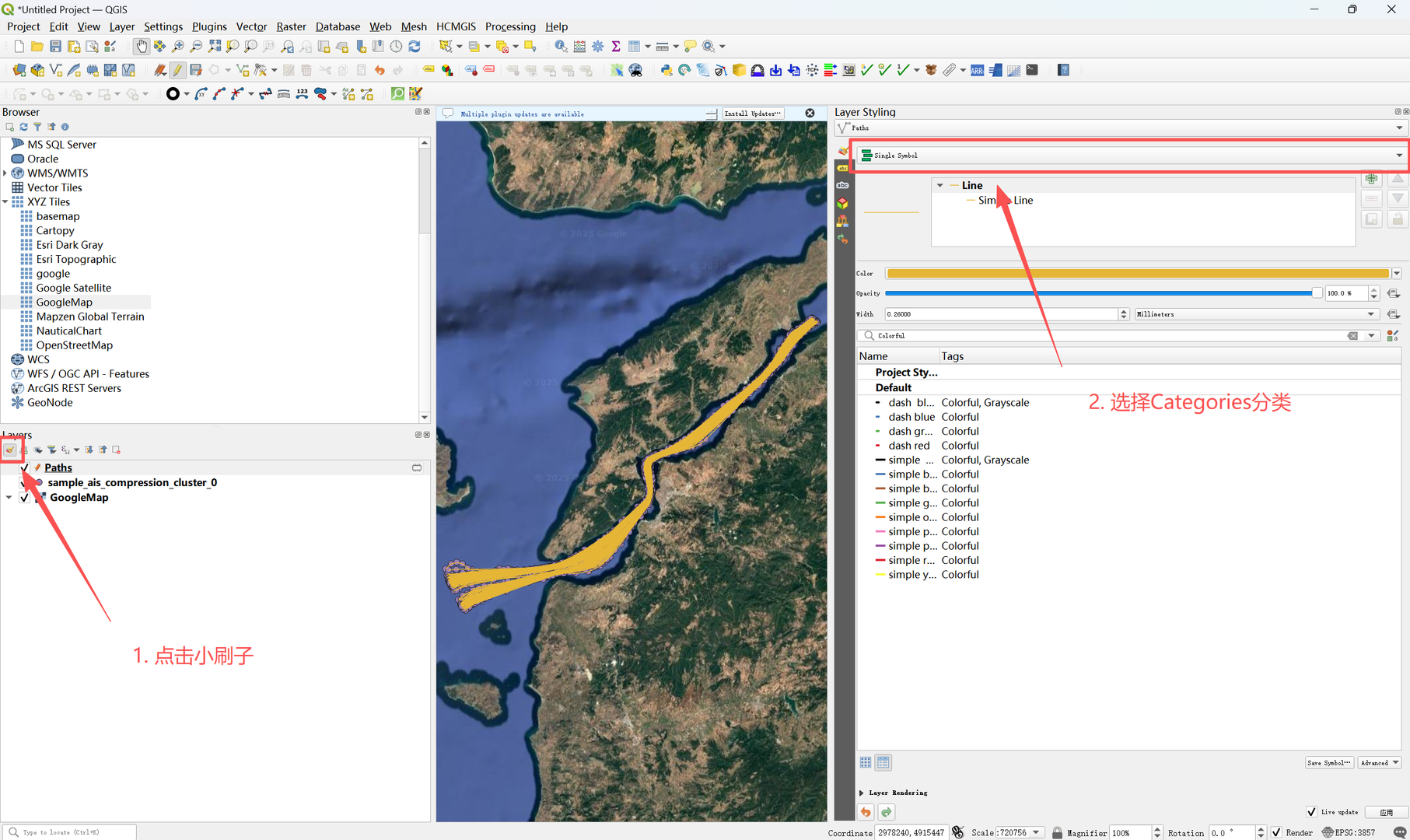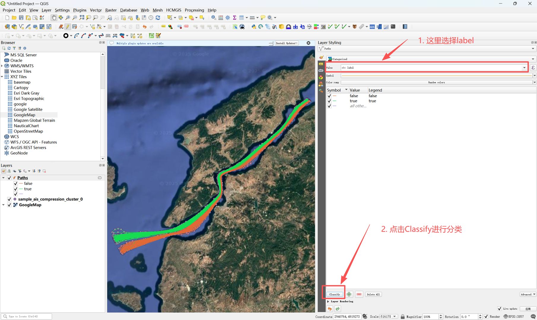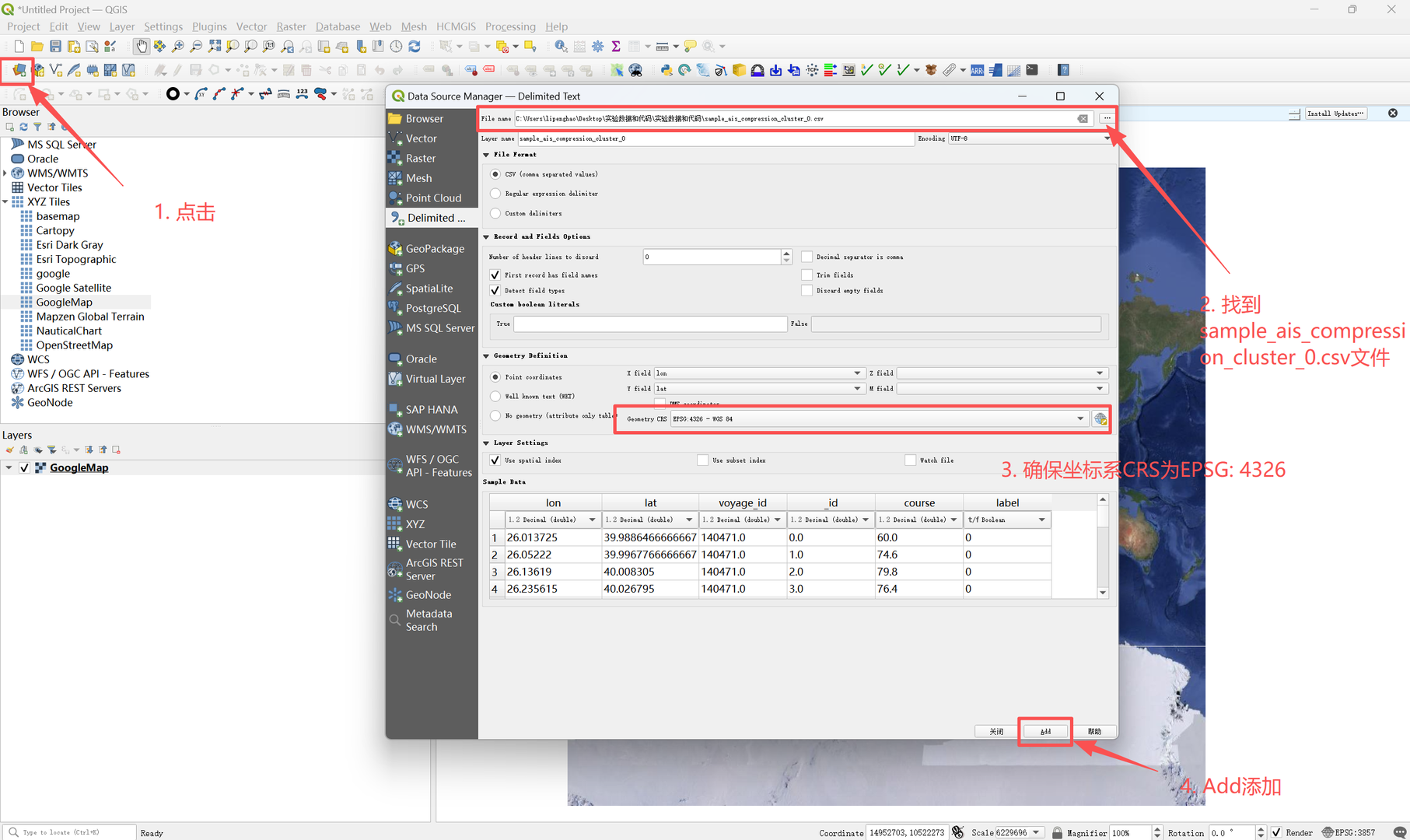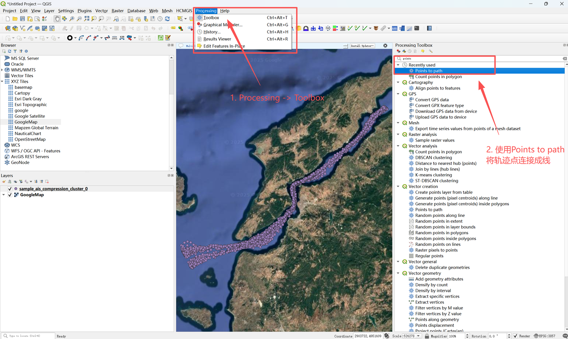 1. 在QGIS中加载sample_ais_compression_cluster_0.csv文件(解压缩.zip后,sample_ais_compression_cluster_0在“实验数据和代码”文件夹下),sample_ais_compression_cluster_0.py可由代码test_canakkale.py执行得到。