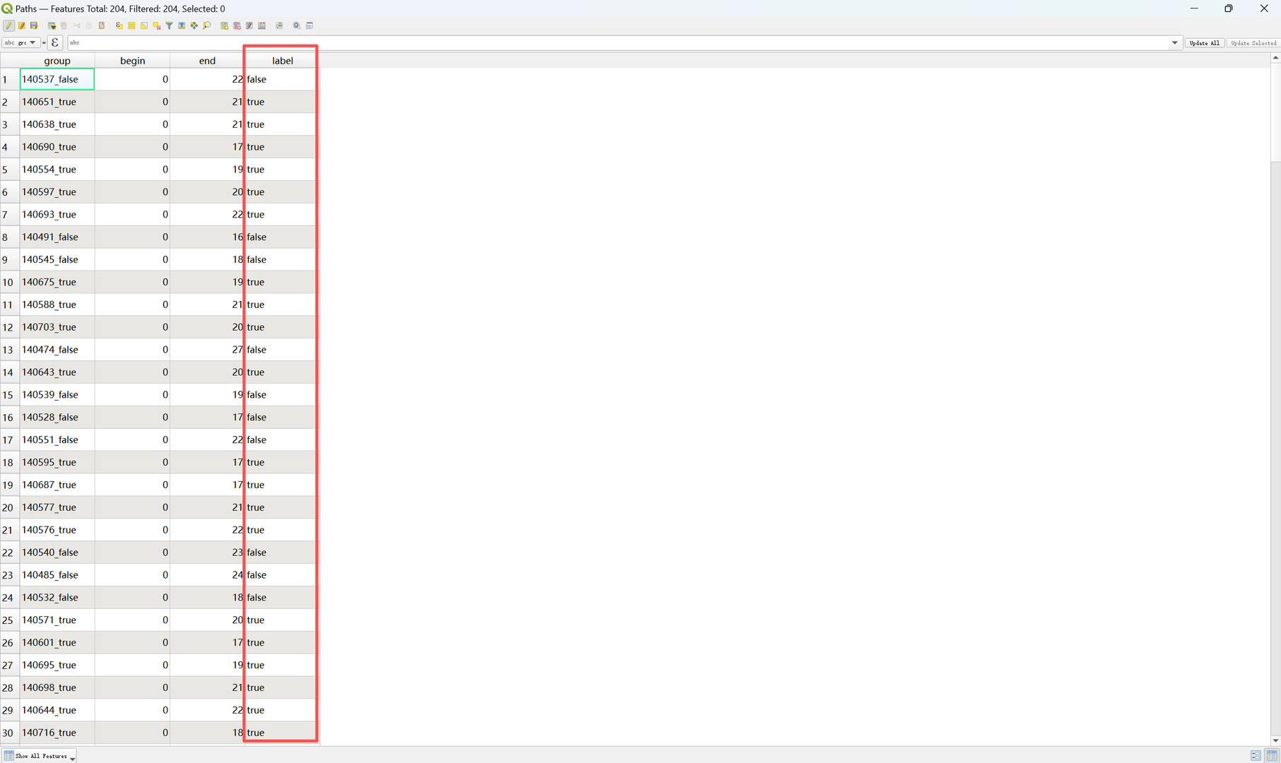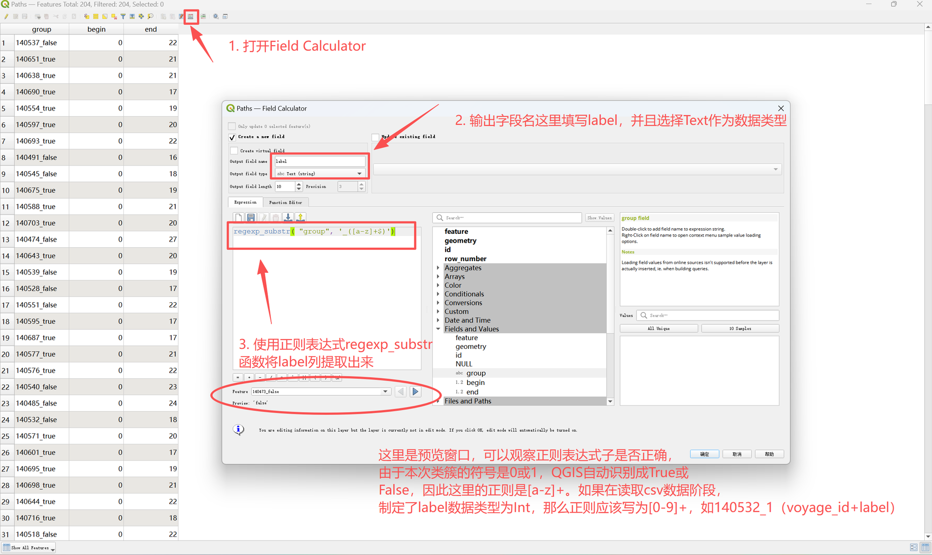 4. 为了使用不同颜色表示轨迹的类簇,需要将label从拼接字段group中分离出来,形成单独的一个新的列