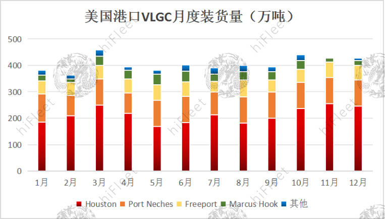 美国港口VLGC月度装货量(数据来源:HiFleet)