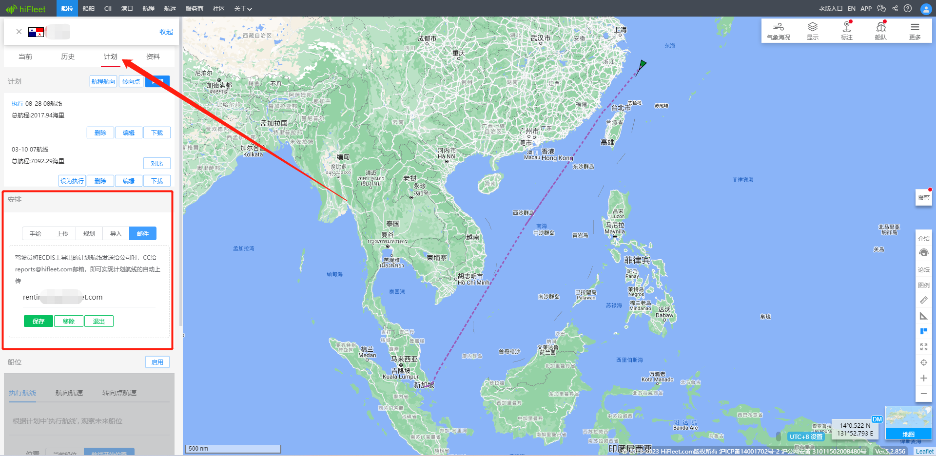 1. 航线上传/规划:首先需要有一条计划航线,航线功能位于船舶“计划”版块,打开HIFLEET平台,选择一艘船舶,进入“计划”页面,我们有四种方式可以上传/规划/导入航线:手绘航线、航线文件上传、航程规划、邮箱登记。