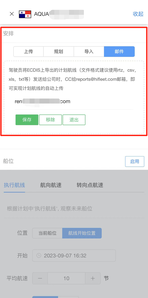 邮箱登记:点击“邮件”按钮,设置邮箱后进行保存,驾驶员或海务人员将ECDIS上导出的计划航线发送给公司时,CC给reports@hifleet.com邮箱,即可实现计划航线的自动上传。