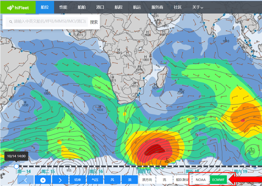 在以往美国NOAA气象数据的基础上,引入了欧盟ECWMF气象数据,细心的用户也会发现在HiFleet网站的“气象海况”页面中已经可以自主切换不同数据源的显示模式了。在发往船舶的邮件中,以前有的预报时刻会缺少风浪和涌浪数据。现改为欧盟ECWMF气象数据,这种情况几乎没有了。
