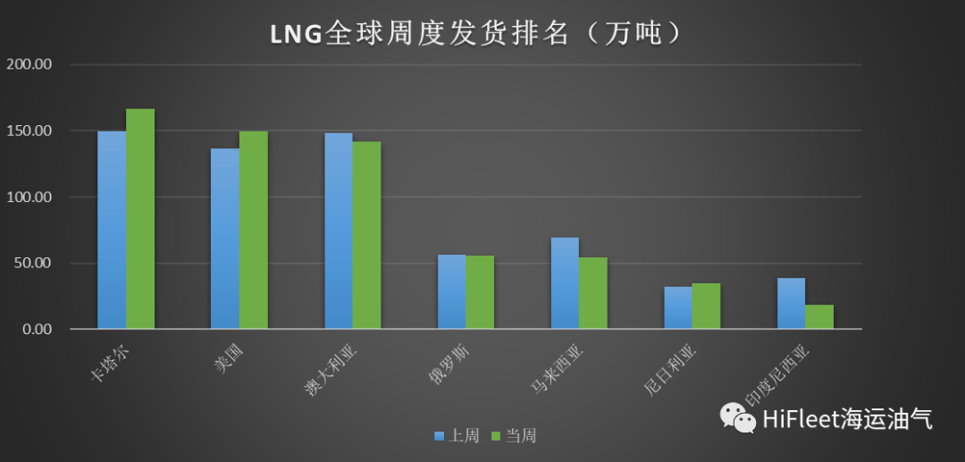 如图为LNG货源国周度发货全球分布图,主要气源国发货量依次排名:卡塔尔、美国、澳大利亚、俄罗斯、马来西亚、尼日利亚、印度尼西亚。卡塔尔全球发货量第一,较上周环比增加11%,货量增加17万吨;美国全球发货量第二,较上周环比增加9%,货量增加13万吨;澳大利亚全球发货量第三,较上周环比减少4%,货量减少6万吨。