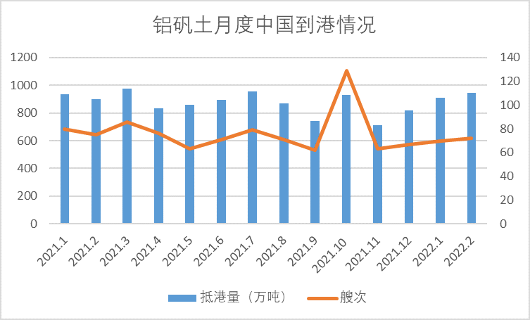 烟台港作为中国最大的铝矾土进口港,2月份共进口铝矾土298万吨,其中从几内亚进口238万吨,龙口港本月有100万吨铝矾土到港。