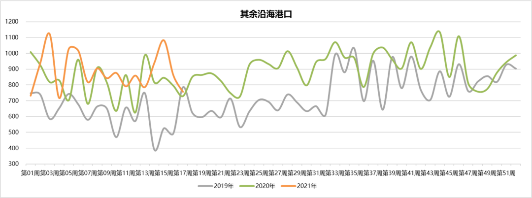 其余沿海港口共计到港755.9万吨,环比减103.4万吨。2021年1-17周,其余沿海港口累计到港15063.3万吨,累计同比增8.12%。