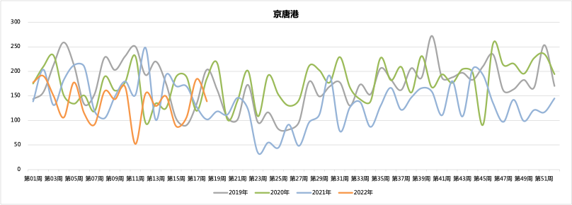 北方六港共计到港897.9万吨,环比减221.2万吨。2022年1-18周,北方六港累计到港17654.9万吨,累计同比减1.59%。