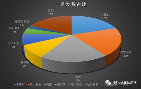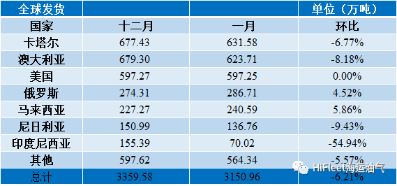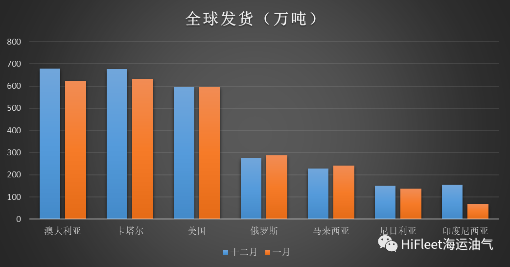 如图为LNG主要货源国对比图,主要气源国1月发货量依次排名:澳大利亚,卡塔尔,美国,俄罗斯,马来西亚,尼日利亚,印度尼西亚,与12月相比,仅尼日利亚和印度尼西亚的排名发生了交换。本月俄罗斯、马来西亚发货量较上月都有不同程度的增加;澳大利亚、卡塔尔、尼日利亚、印度尼西亚、美国发货量较上月有所减少。
