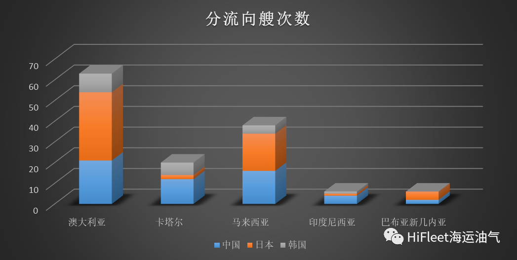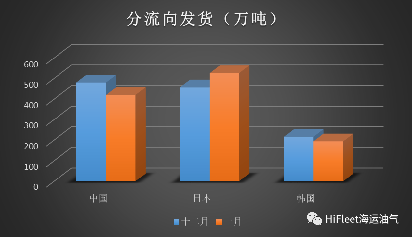 从货物运输流向来看,中日韩天然气进口总量预计占全球出口总量的36.2%。本月发往中国59艘,总量约420.6万吨;发往日本85艘,约525.7万吨;韩国32艘,约194.1万吨。