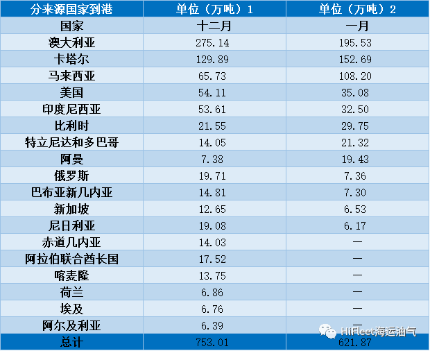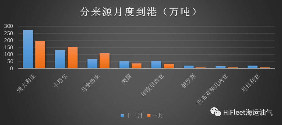 1月中国到港621.87万吨,较上月相比减少131.14万吨,环比下降14.72%。从图表中可以看出,澳大利亚到港占比仍旧第一,1月份占比31.44%;此外,卡塔尔、马来西亚、比利时、特立尼达和多巴哥、阿曼较上月到港都有不同程度的增加;澳大利亚、美国、印度尼西亚、俄罗斯、巴布亚新几内亚、新加坡、尼日利亚较上月到港都有不同程度的减少;荷兰、埃及、阿联酋、喀麦隆、阿尔及利亚、赤道几内亚1月无到港船舶。