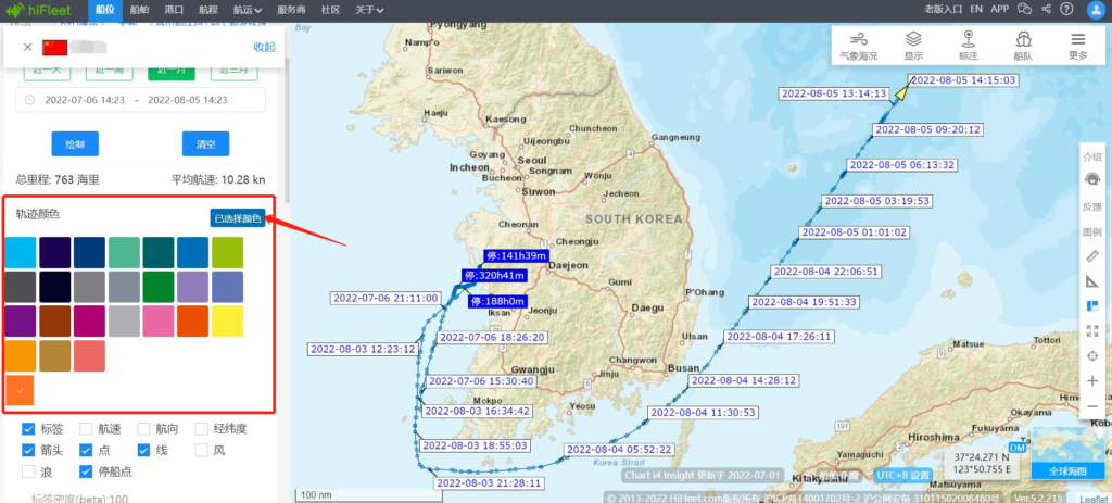 Ver.5.2.232 根据船舶航速显示船首矢量线长度,新增单船历史轨迹颜色自定义 1.【优化】根据船舶航速显示船首矢量线长度 调整前船首矢量线都为一个长度,调整后根据船舶航行的速度,船首矢量线长度按照5节以下、5-10节、10-15节、15节以上,分别设置为不同长度,方便用户辨认船舶航行中的速度。 2.【新增】单船历史轨迹颜色自定义 在历史轨迹页面中,可以根据查看轨迹的范围设置时间,下方有四个快捷选项,近一天、近一周、近一月、近三月,时间范围的设置不宜超过三个月,否则会因为轨迹点过多而无法加载页面。 拖动页面至轨迹颜色,点击【点此选择颜色】,自定义选择需要用的轨迹颜色,海图页面上的轨迹颜色也将改变。 点击最下方的色块可调出调色板,输入色号或者滑动轮盘可以选择更多颜色。 1,516
